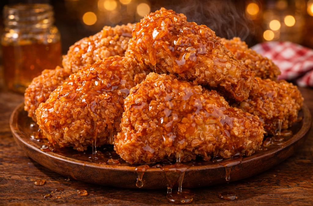 Few dishes bring as much joy to the table as crispy fried chicken, especially when it’s coated with a sweet