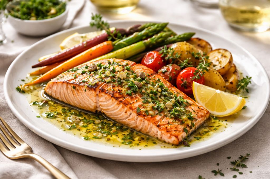 For those who love dishes that are both delicious and refreshing, grilled salmon with herb lemon sauce is an excellent